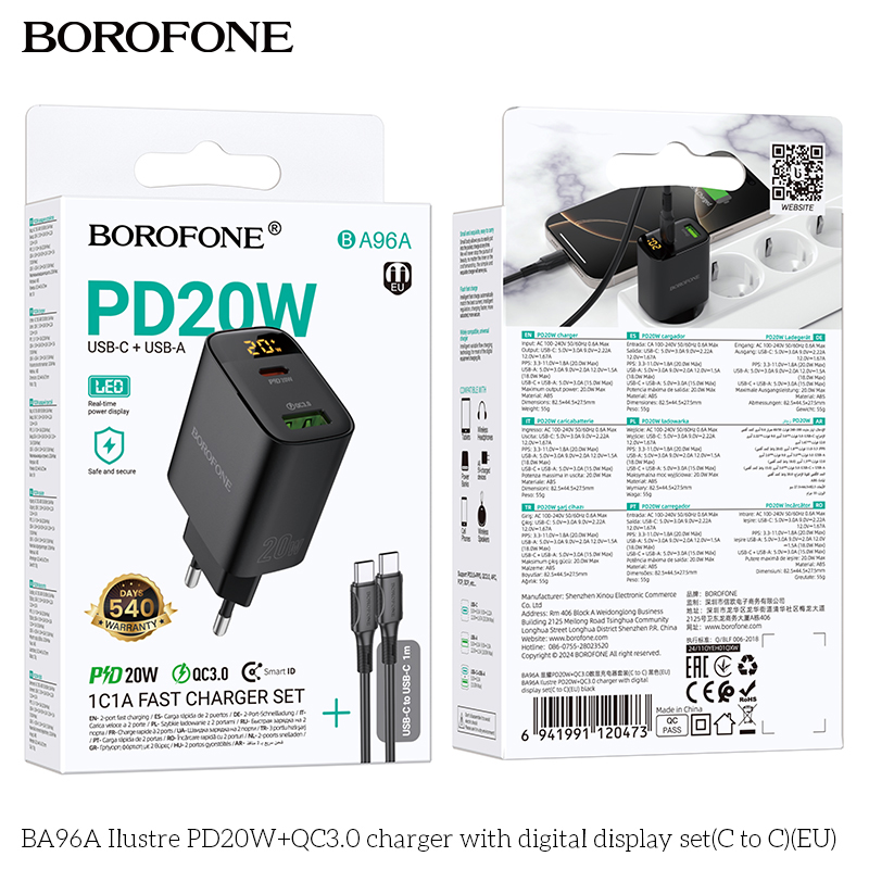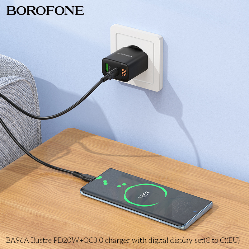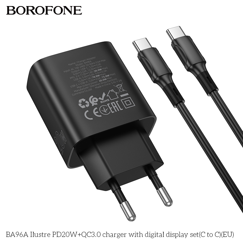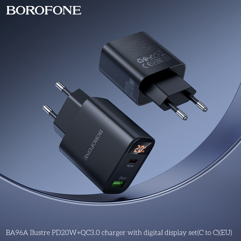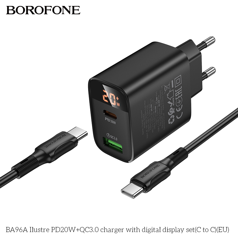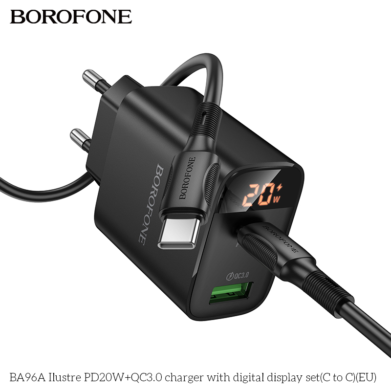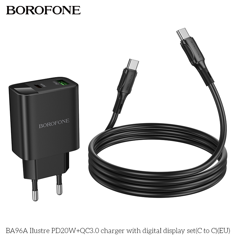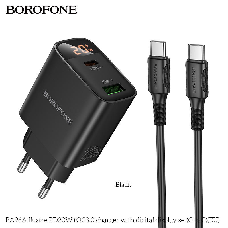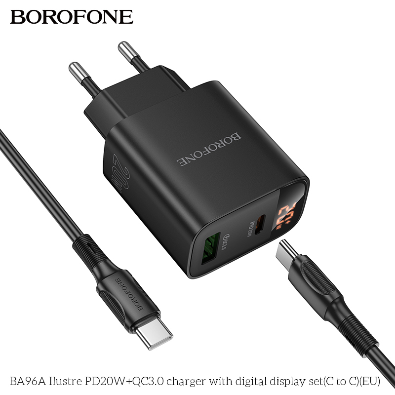 BOROFONE BA96A 20W Type-C+USB Ilustre Digital Display Charger Set with 1M Type-C to Type-C Date Cable Eu plug Black