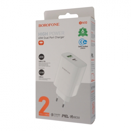 BOROFONE BN10 PD65W Type-C+USB Double Port Charger White EU Plug