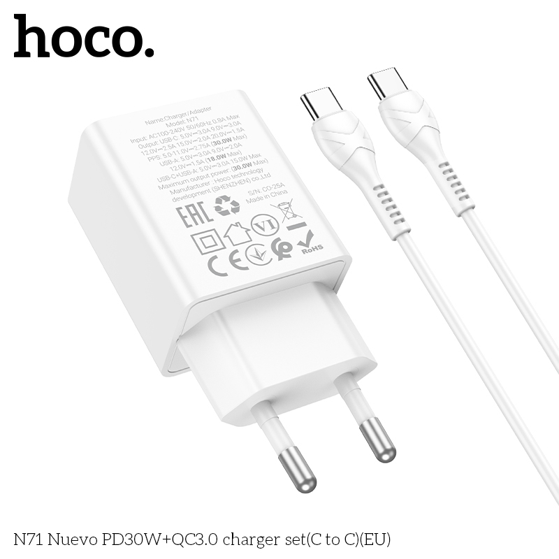HOCO N71 Nuevo PD30W+QC3.0 Charger Set with 1M Type-C to Type-C Cable EU Adapter White
