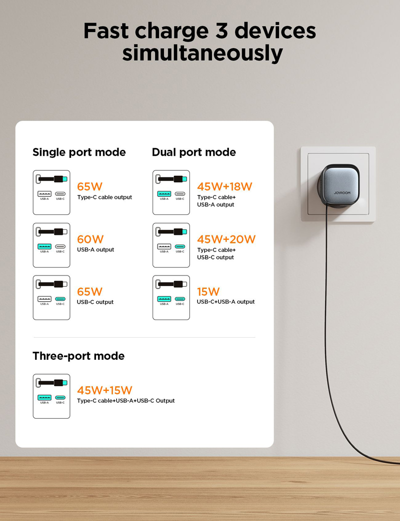 8. USB-C1+C2+USB-A Output: 45W+15W(Max)