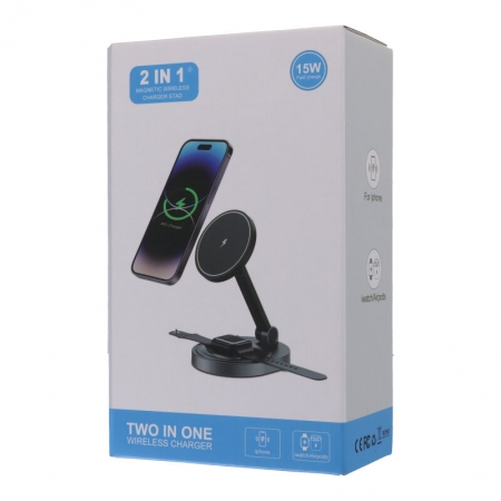 W14 15W 2 In 1 Foldable Magnetic Wireless Charger Stand for iPhone 12-15 Series/Airpods/Apple Watch Black